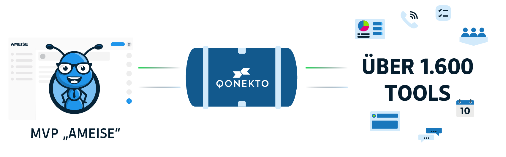 Die Konnektivitäts-Software Qonekto ermöglicht dir nahezu grenzenlose Datenkonnektivität zwischen dem MVP AMEISE und mehr als 1.600 externen Produktivitäts- und Automatisierung-Tools wie z.B. Calendly, Superchat, oder Meistertask. Schnell. Robust. Und ganz ohne Programmierkenntnisse.